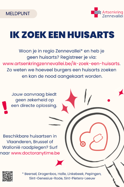 In het kader van het huisartsentekort werd het meldpunt ‘Ik zoek een huisarts’ gelanceerd op de website van Artsenkring Zennevallei (www.artsenkringzennevallei.be/ik-zoek-een-huisarts/ of www.artsenkringzennevallei.be/je-cherche-un-medecin-generaliste voor de Franstalige versie). Het meldpunt is opgericht zodat inwoners uit regio Zennevallei die geen huisarts hebben een aanvraag voor zichzelf, hun gezin of een kennis kunnen doorgeven.